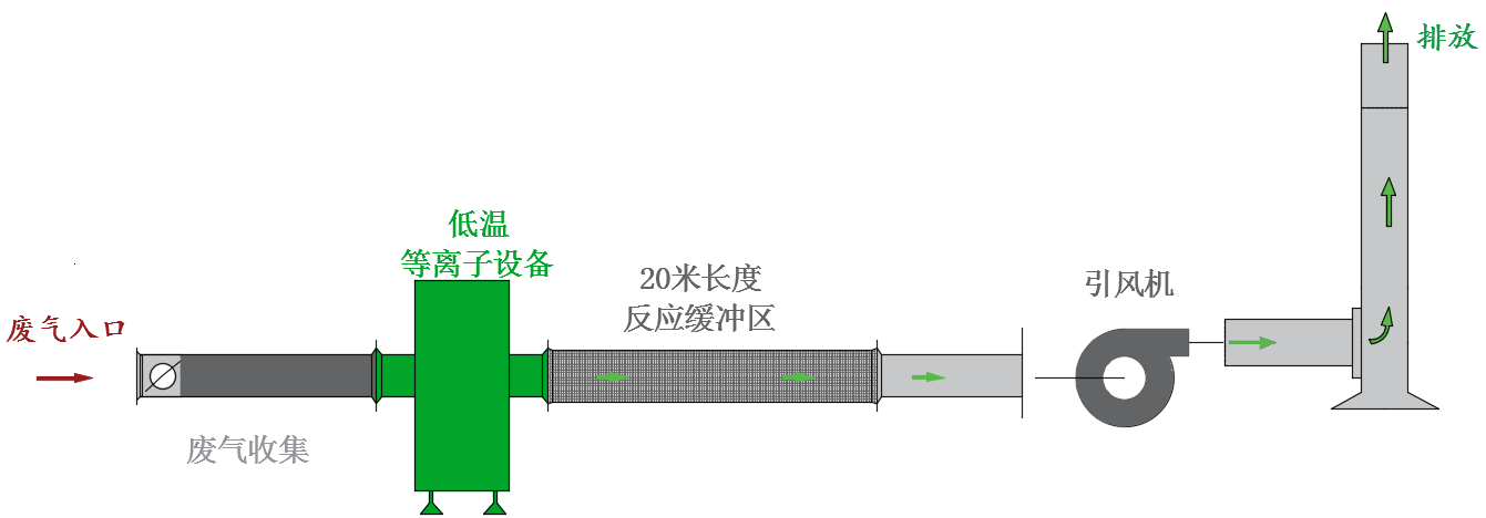 廢氣經低溫等離子處理設備處理后,還需經過一段不少于20米間隔的反響緩沖區,在此區間低溫等離子處理設備發作的臭氧與廢氣中殘余成分充沛反響以達到最佳處理作用。